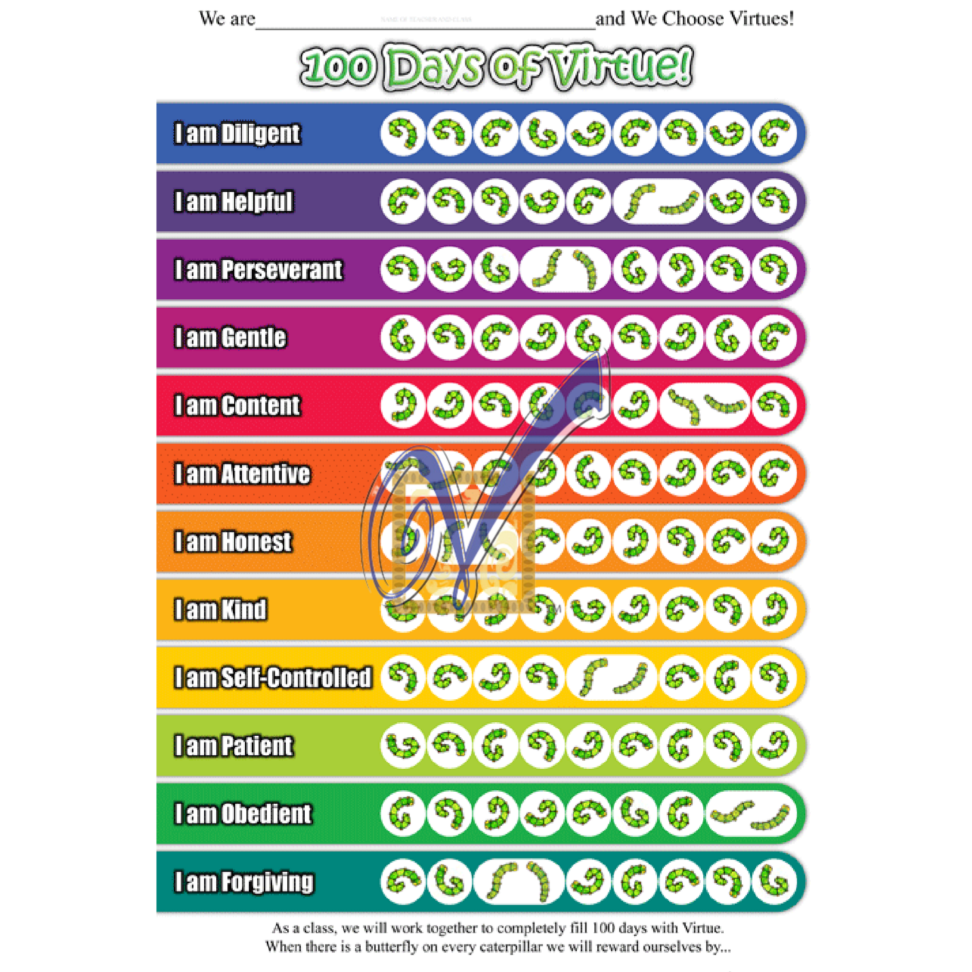 - 100 Days of Virtue Chart and Butterfly Stickers for motivating your family to use their Virtues for the first 100 days