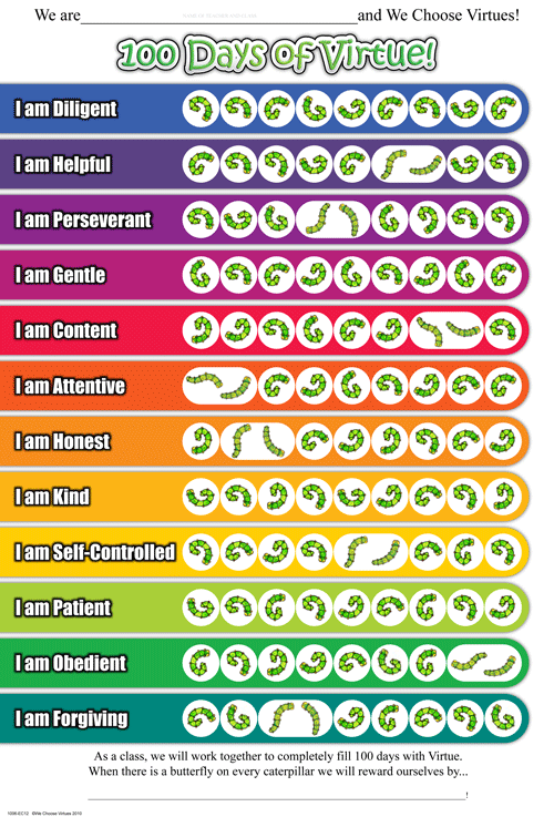 - Fill out the 100 Days of Virtue Chart together with the name of your class at the top. Example: “We are Mr. Thomas' Third grade Class and We Choose Virtues!”