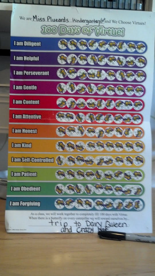 - Talk about what kind of reward they would like when they have reached 100 Days of Virtue, Perhaps a field trip or an ice cream party. This may be an event you would have planned anyway, but just “re-purpose” it to honor the character of your class.