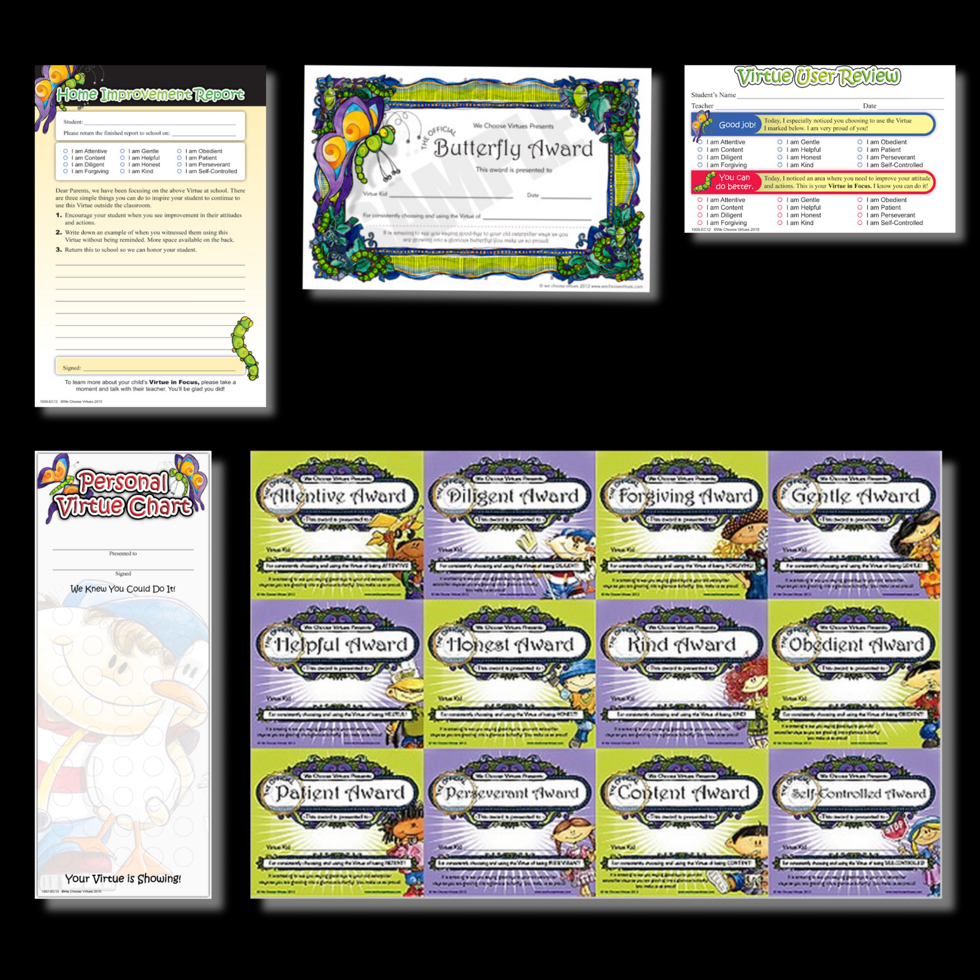 For example, you will have a Home Improvement Report for the parents to fill out for their child, as they watch for examples of a virtue in action at home. Another item is the Virtue User Review; a simple form that highlights the virtue you are seeing growth in, and one you'd like to to see the child focus on at home and school.