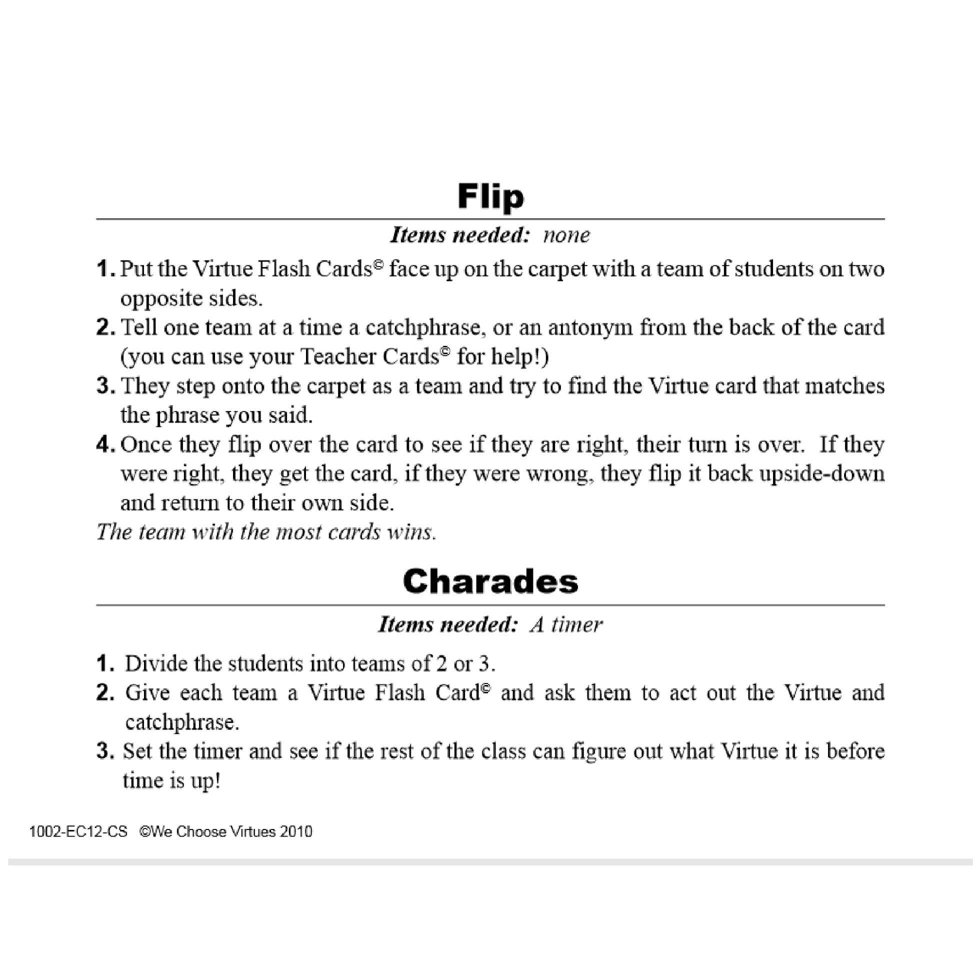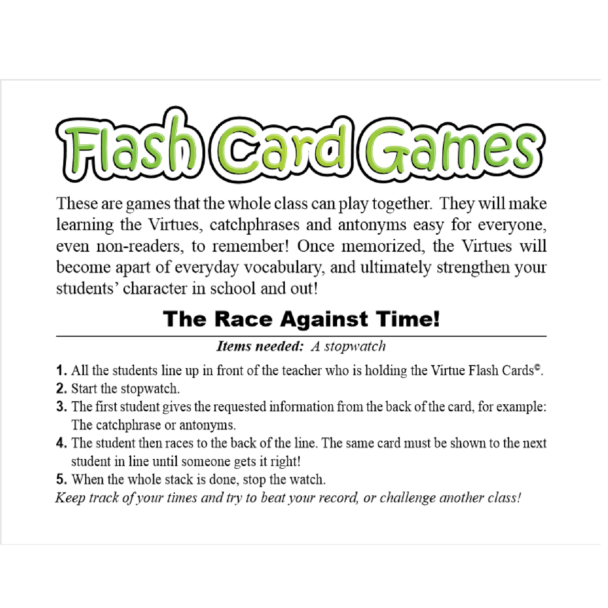 - Play the games on the game card to help reinforce or memorize the Virtue catchphrases and antonyms.